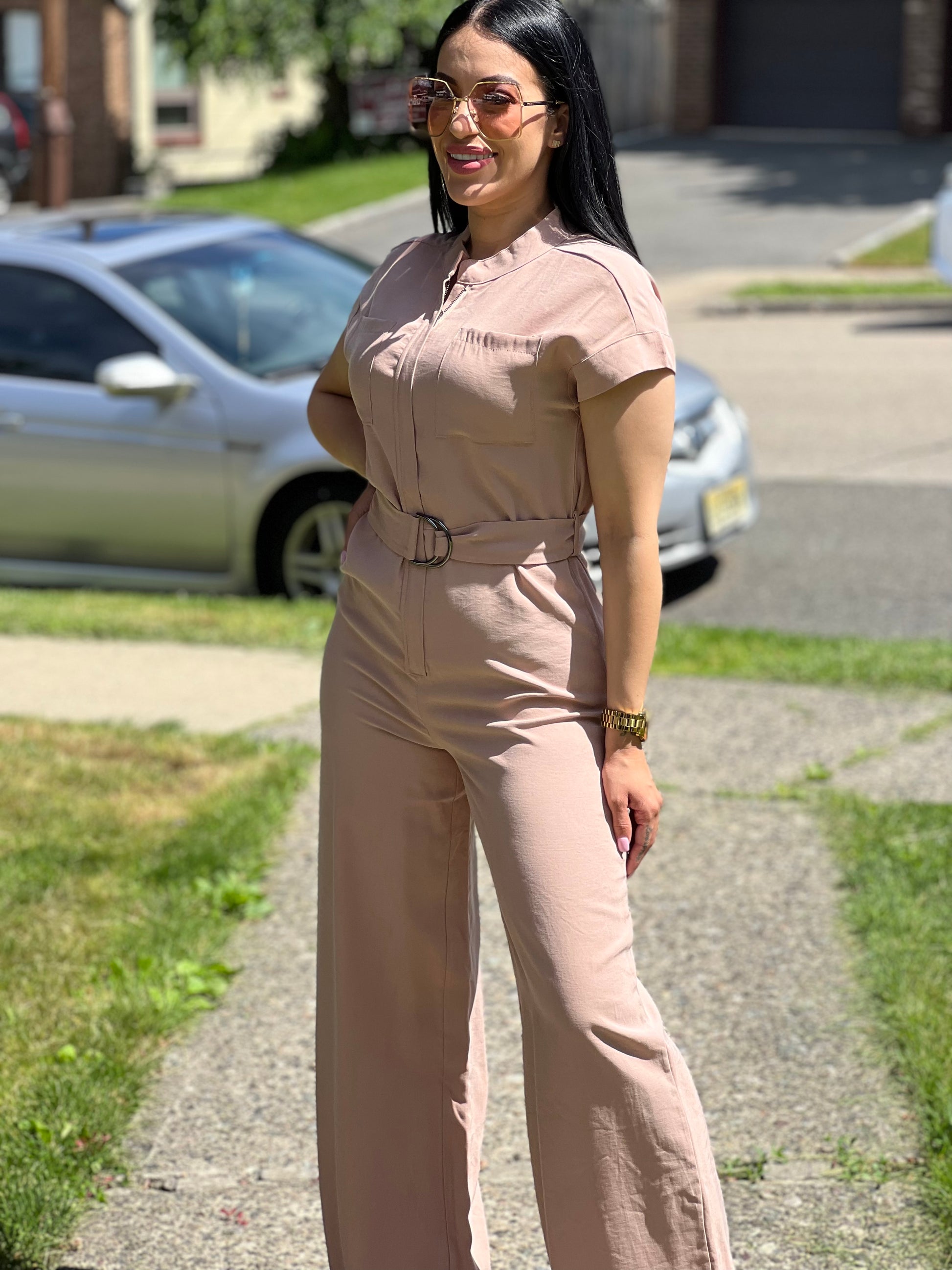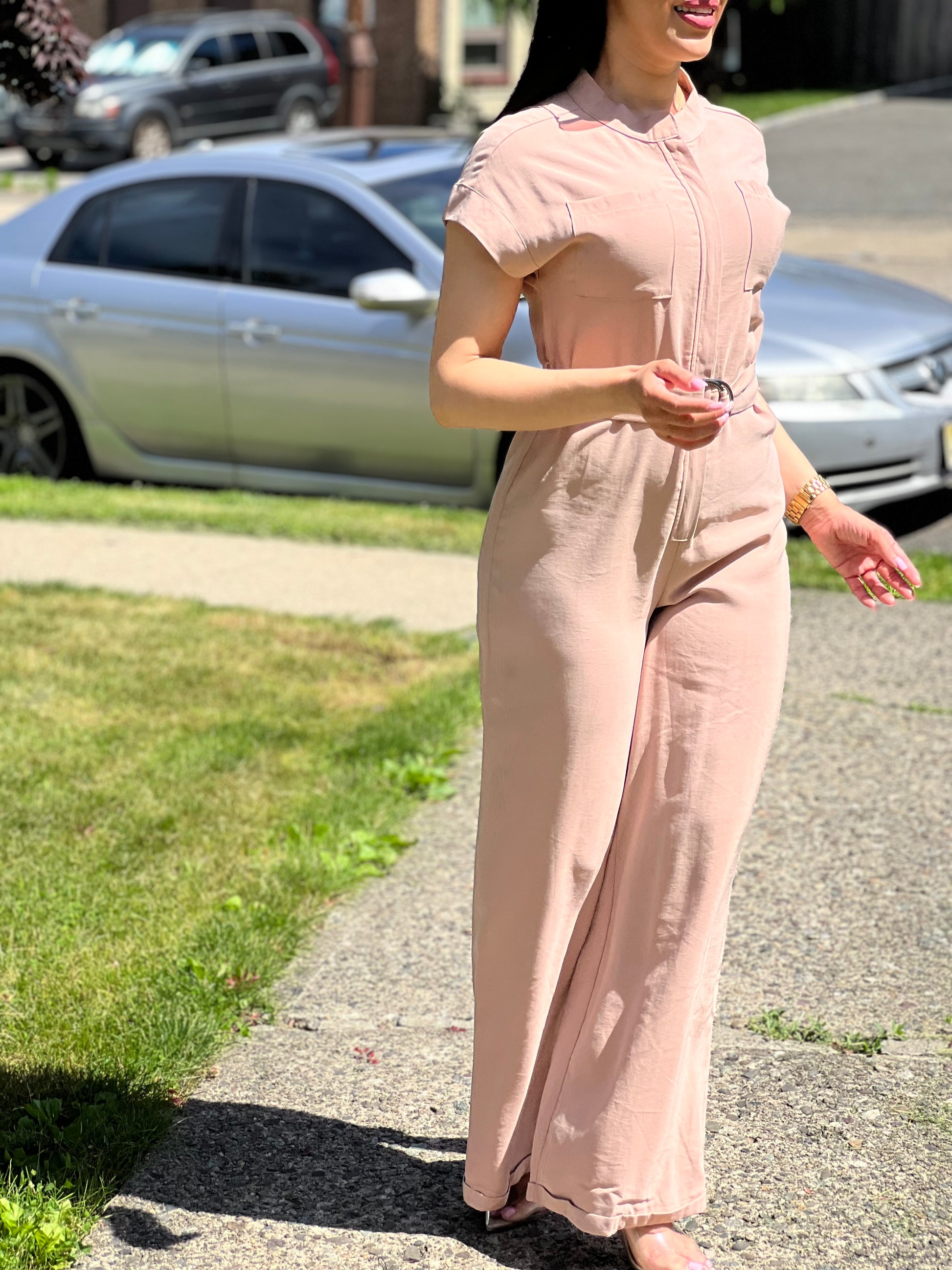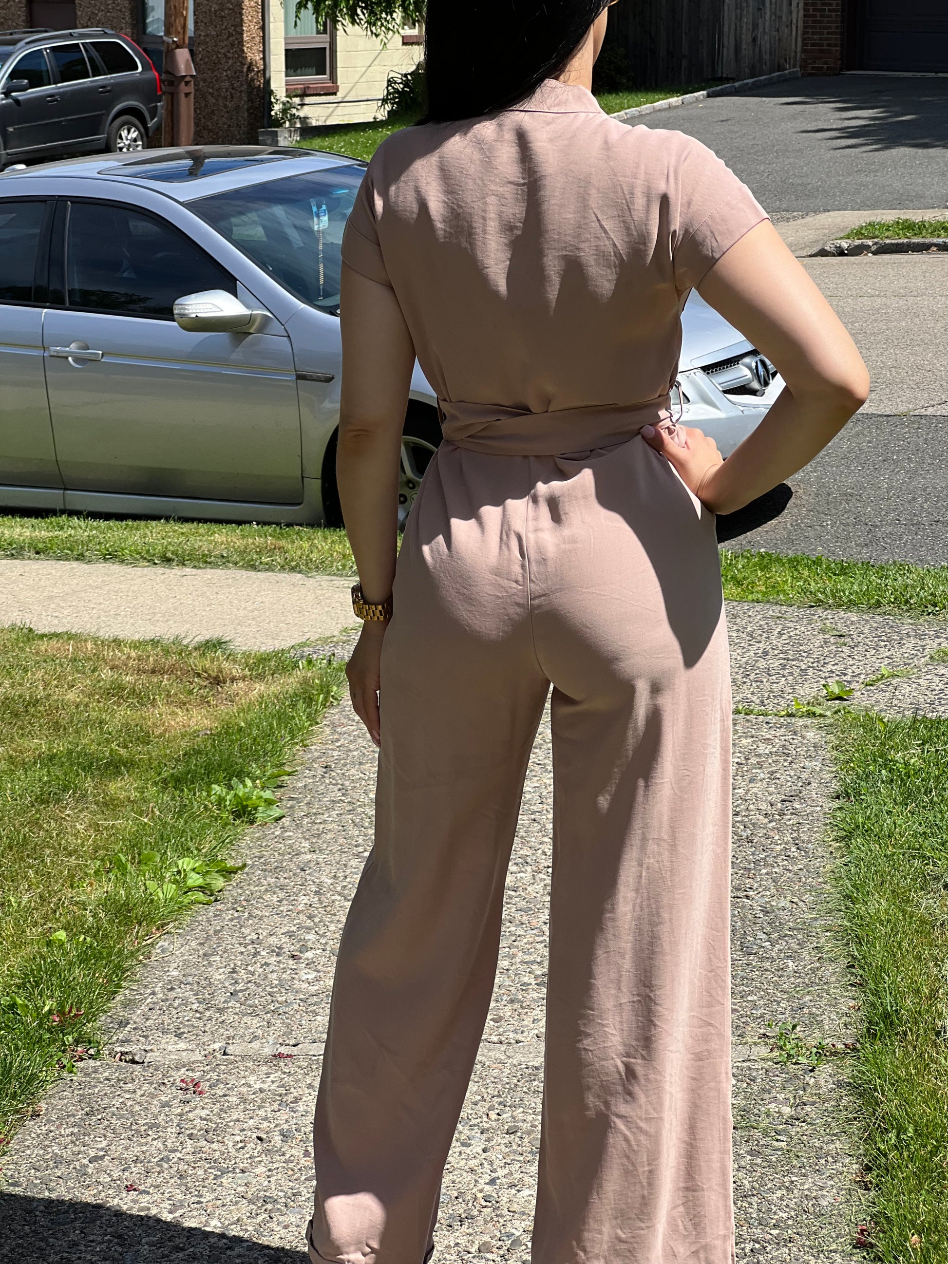 New Summer Fashion versatile turn-down collar short sleeve Jumpsuit waist bandage single breasted casual wide leg Jumpsuit