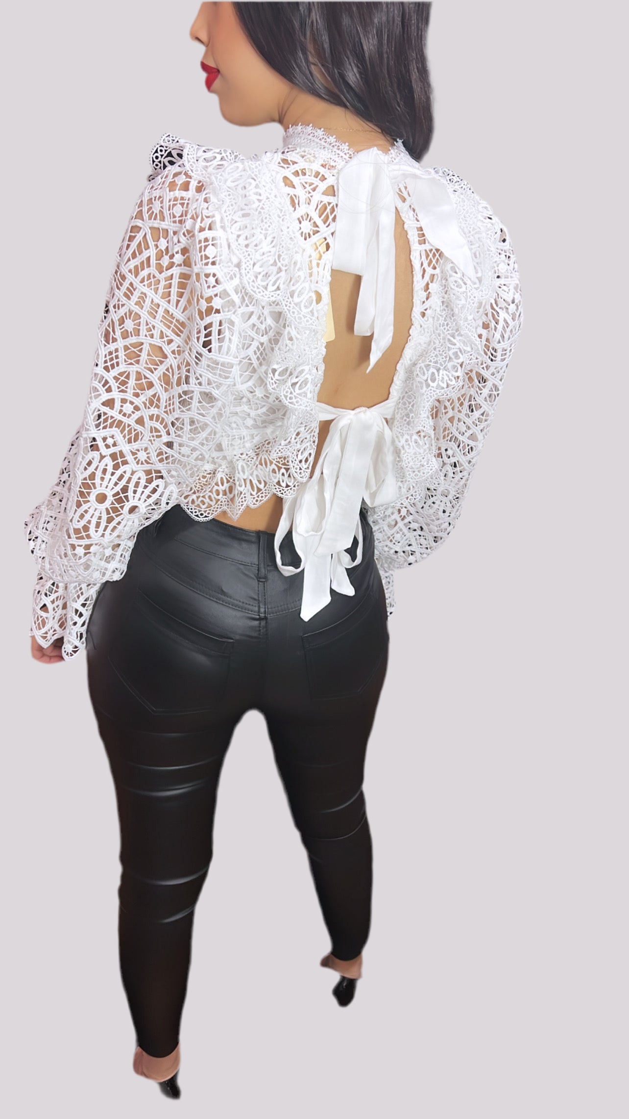 Women Sexy Lace Blouse 2025 Spring Elegant Stand Collar Design Top Hollow Out Petal Sleeve ShirtLady Casual Blusa