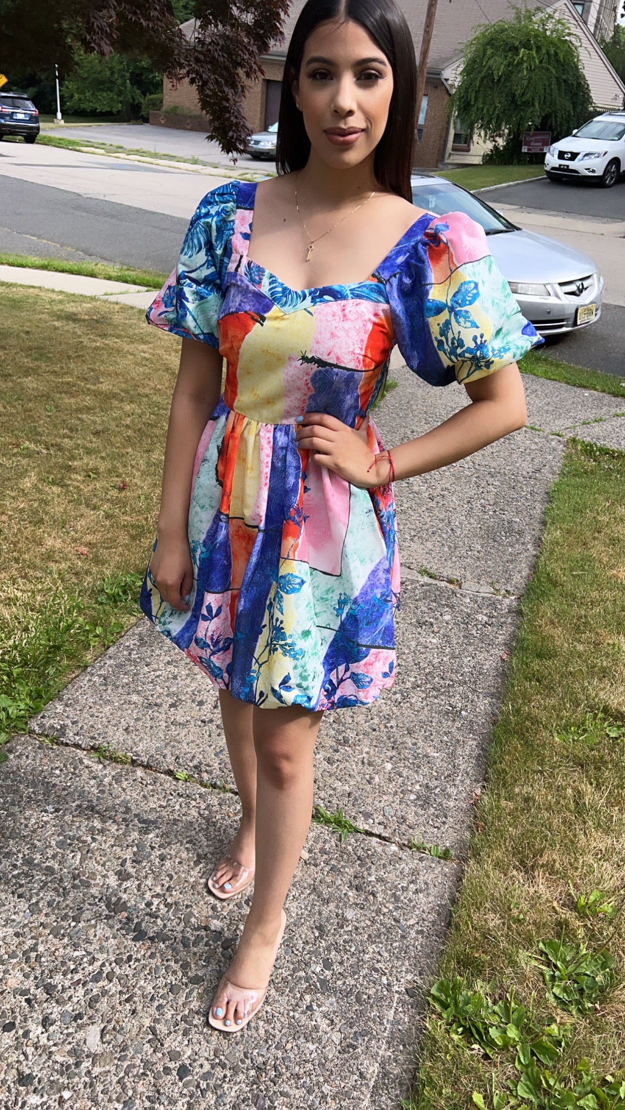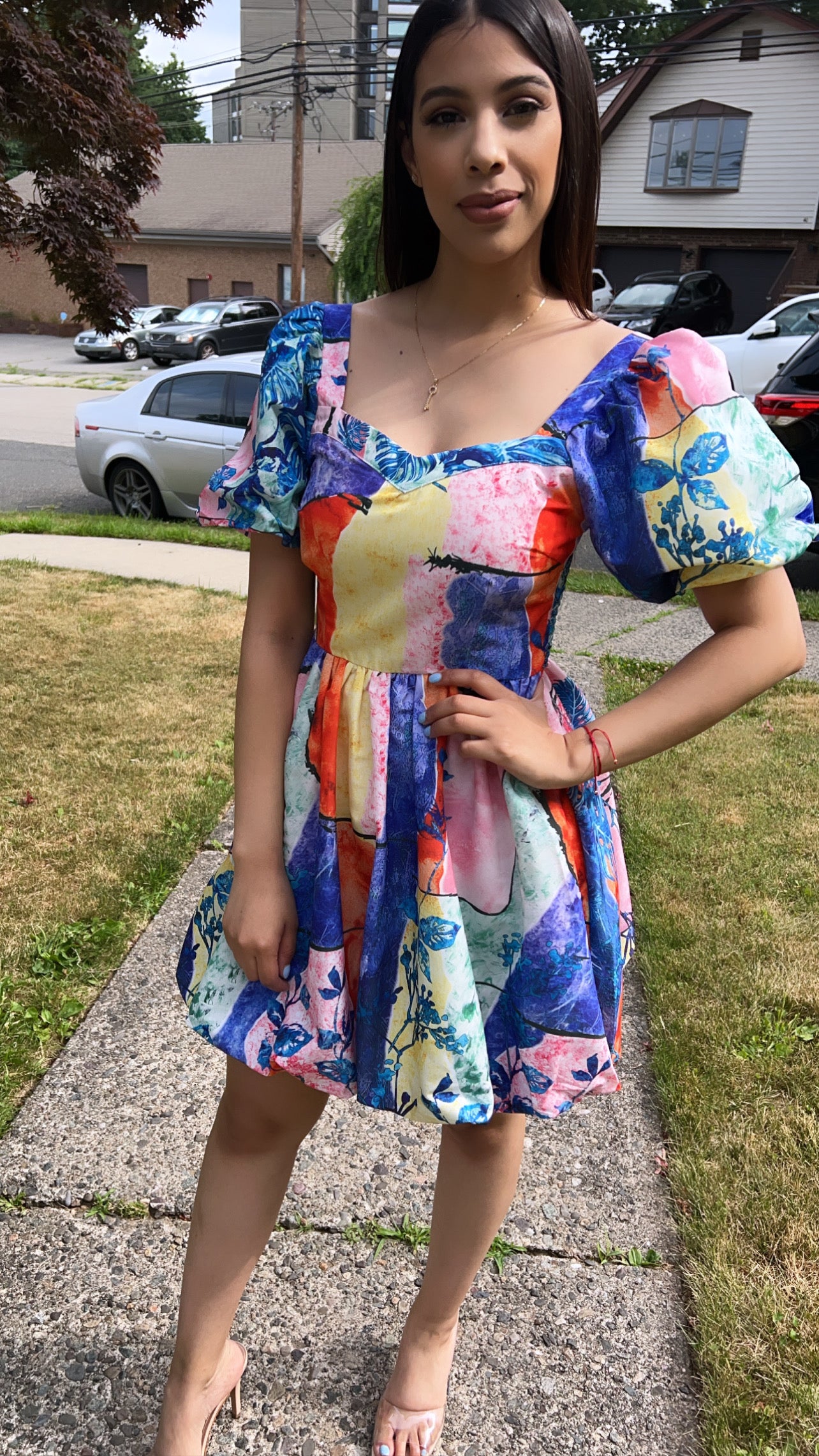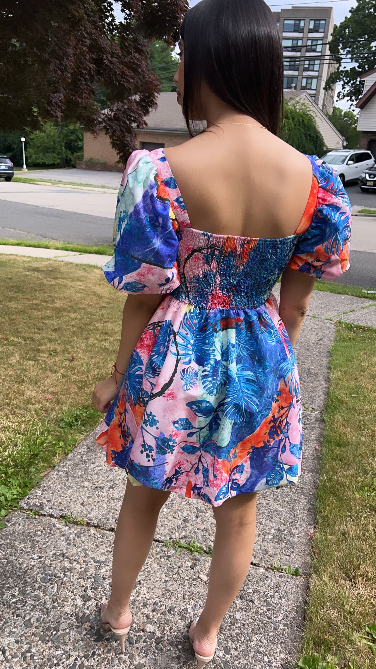 Summer Original Women Dress Generous Collar Printed Puff Sleeves High Waist Loose Dress Mini Dresses
