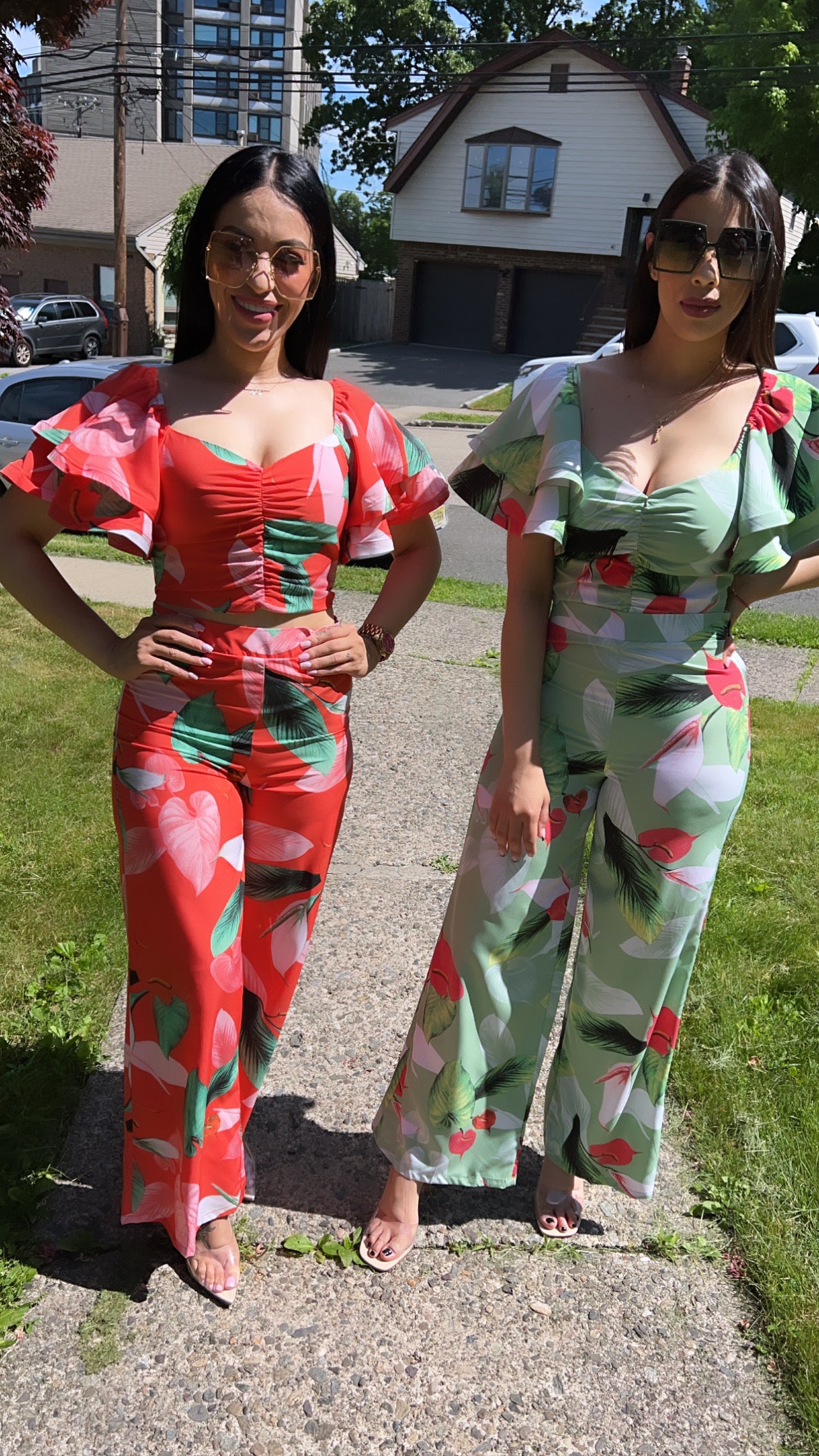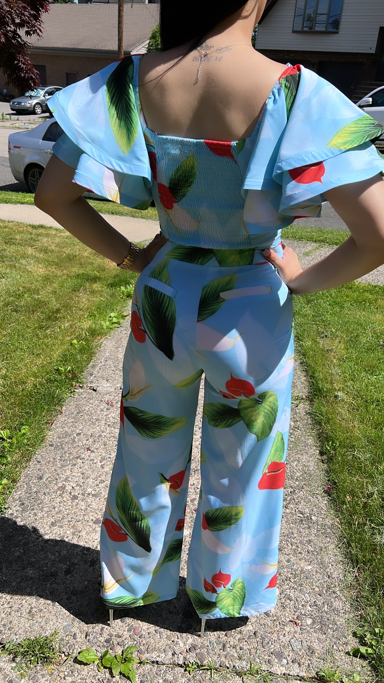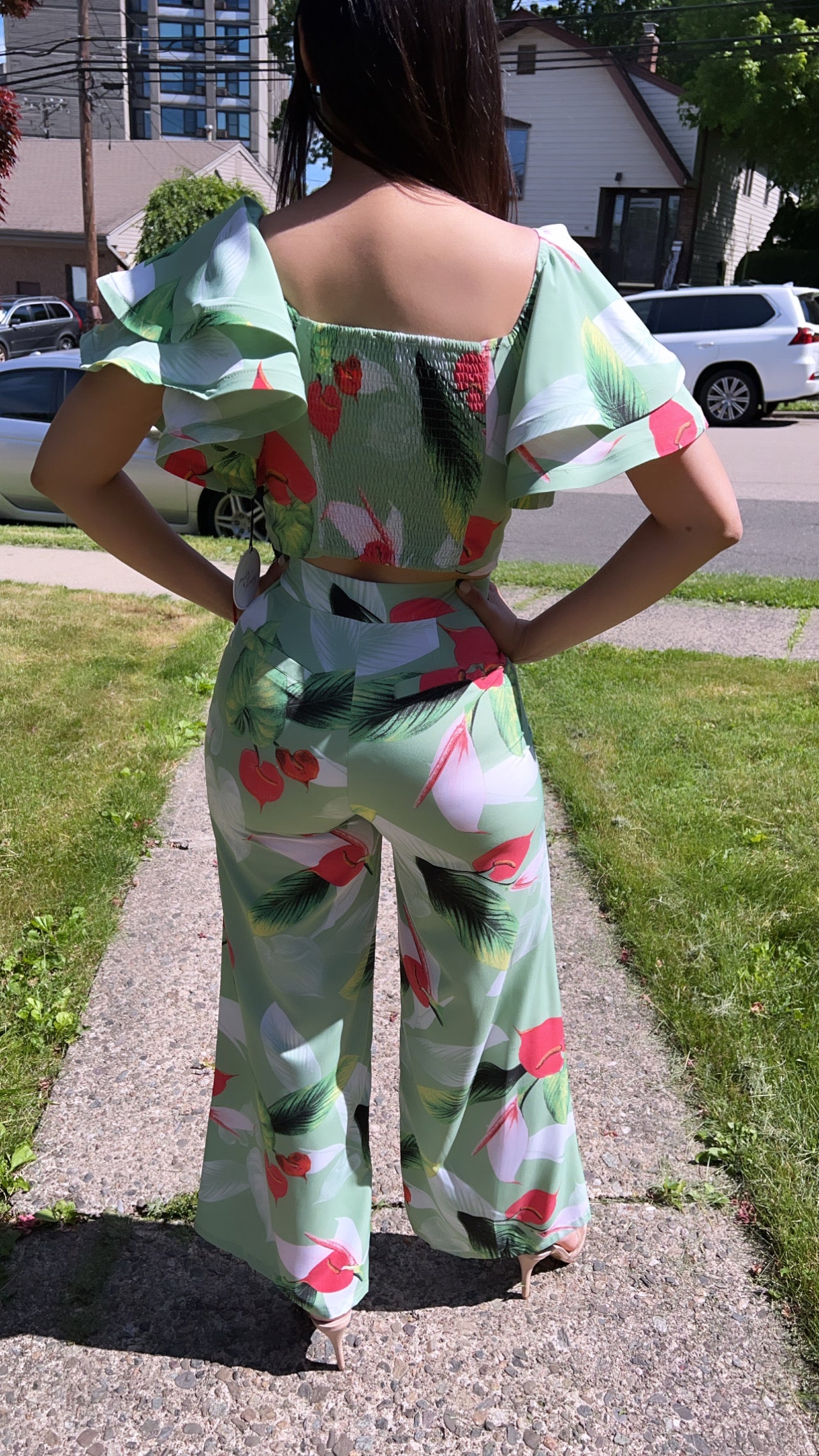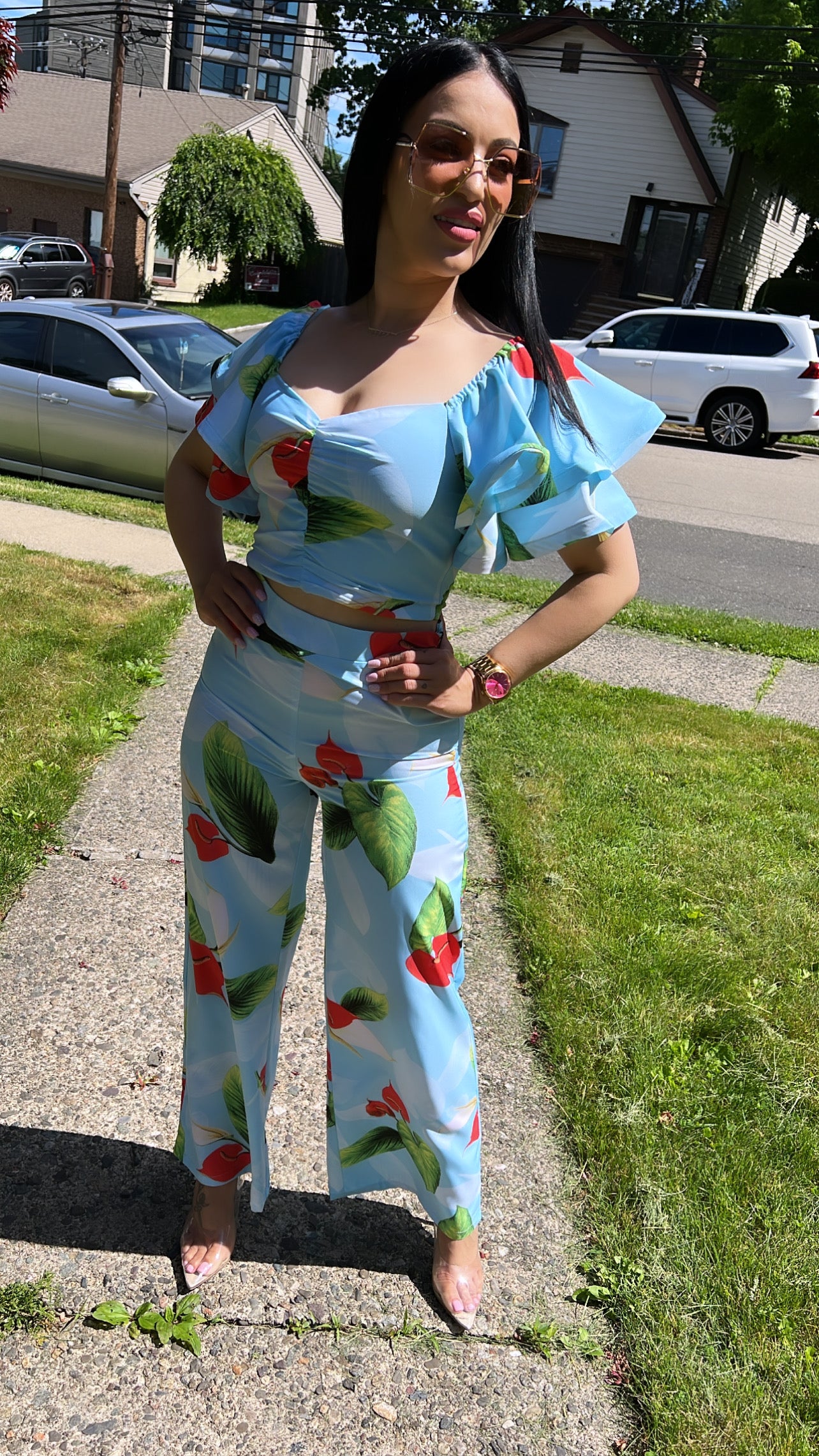 New Printed Chiffon Set Stand-up Collar Crop top Women's Versatile High-waist Wide-leg Pants Two-piece Suits