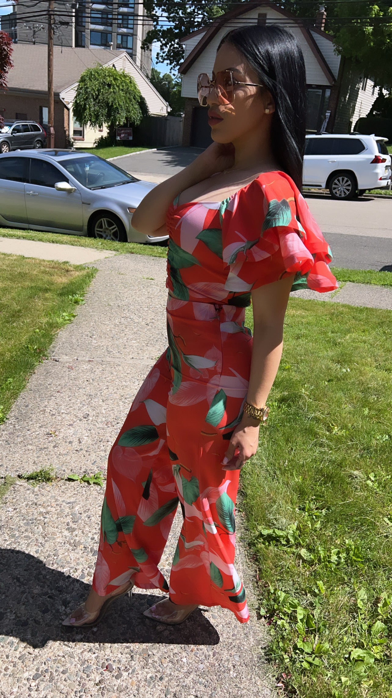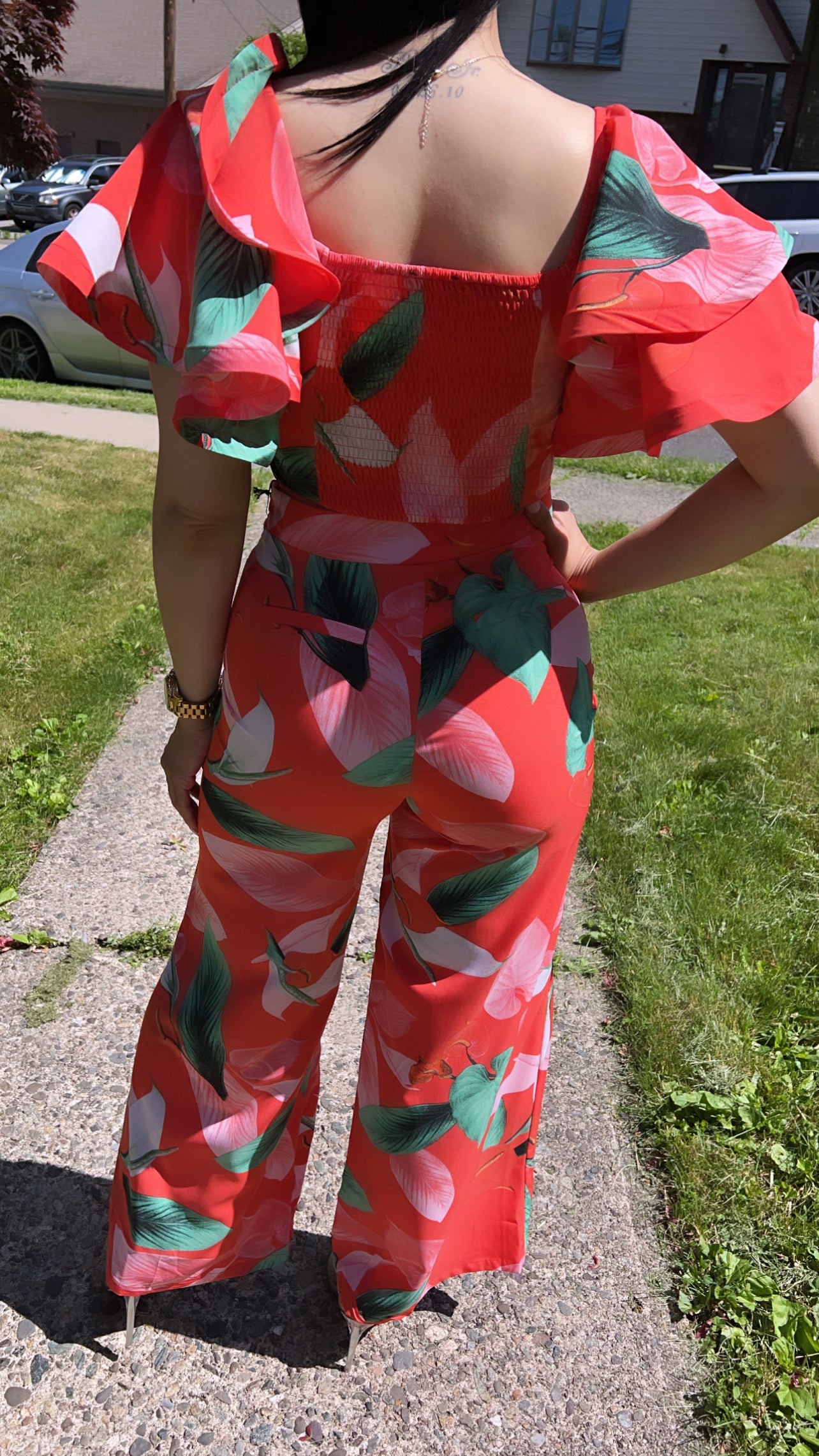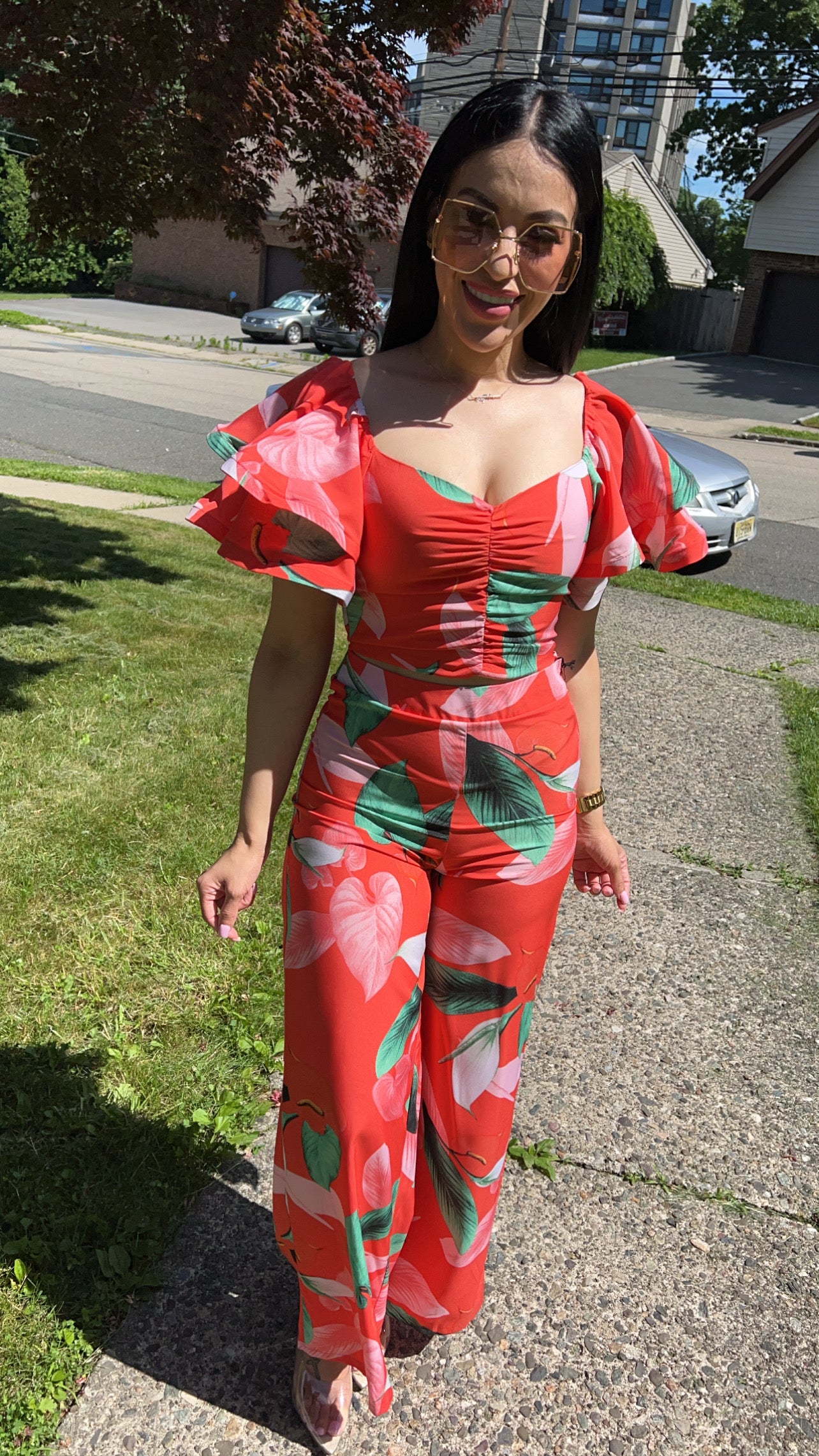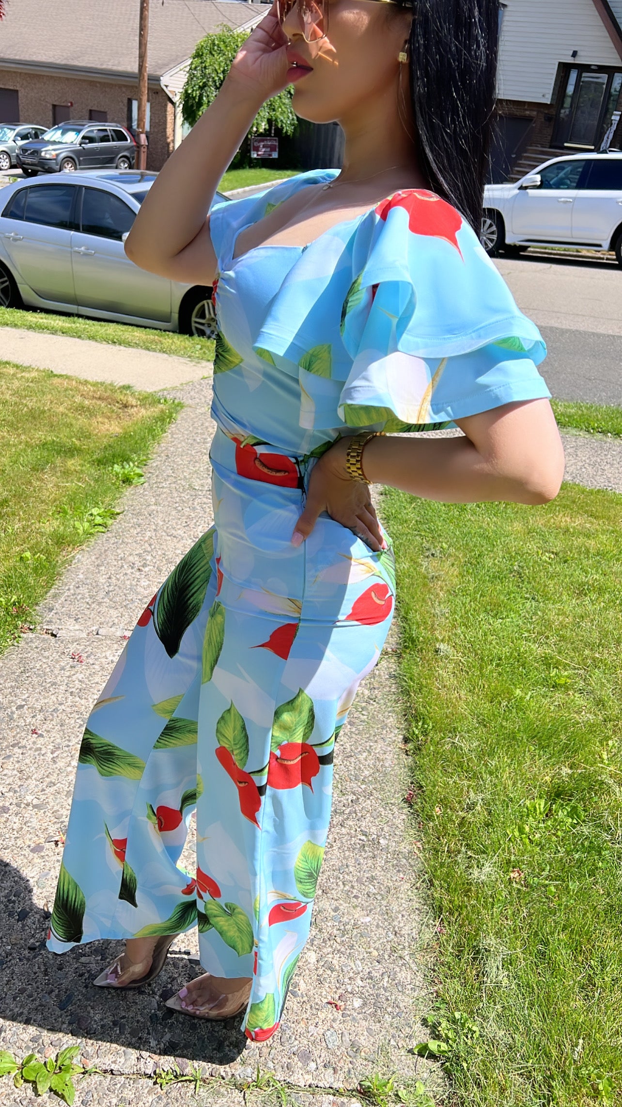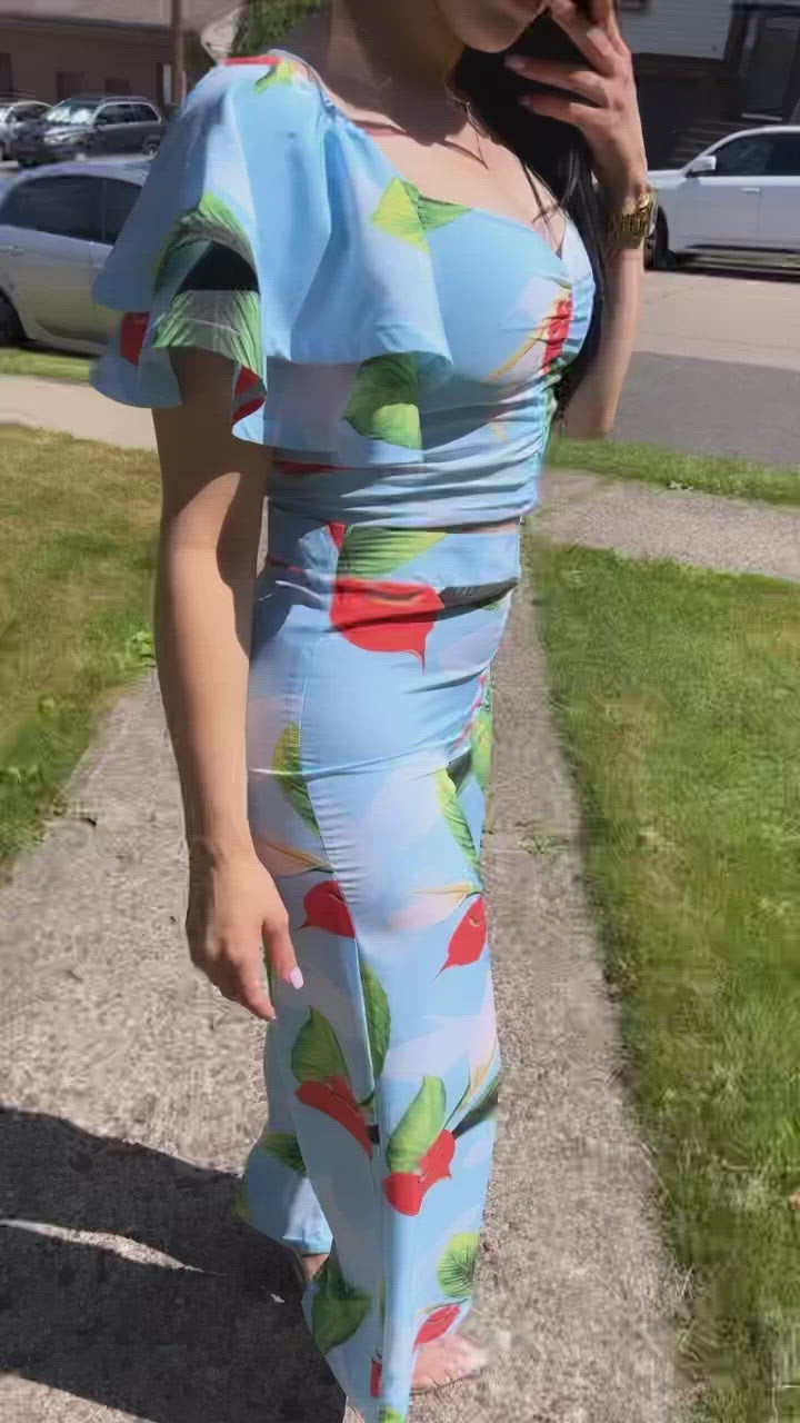 New Printed Chiffon Set Stand-up Collar Crop top Women's Versatile High-waist Wide-leg Pants Two-piece Suits